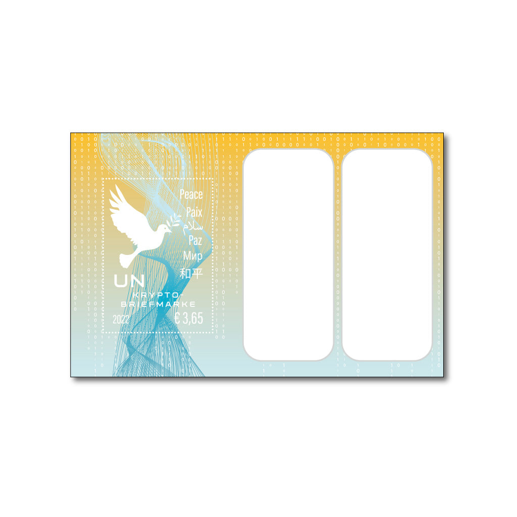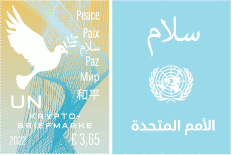 The Krypto Briefmarke from the Vienna office features the German inscriptions and a face value of € 3,65 and shows a dove holding an olive branch as peace symbol.